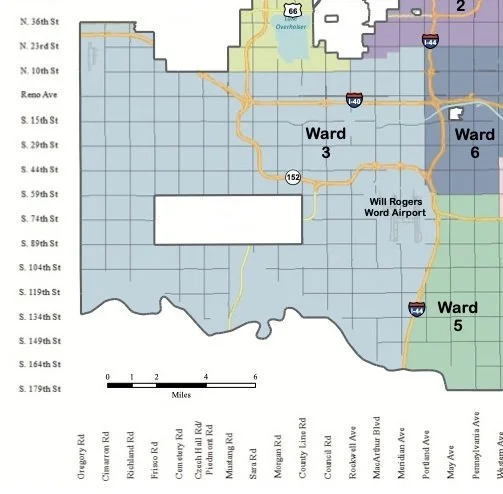 You can refer to the map at the right for a general idea, but the best way to check is by using the interactive ward map tool on the OKC website: okc.gov/wardmap